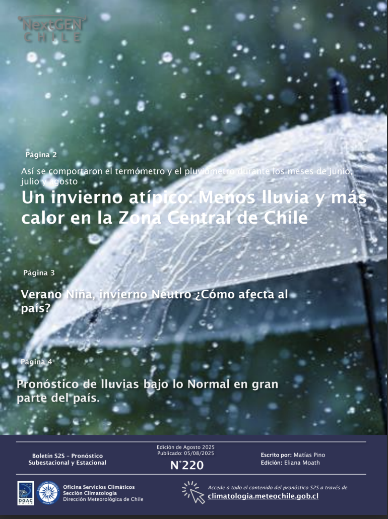 Boletín Tendencias Climáticas SON 2025 por jvrengo | Sep 8, 2025 | Noticias | 0 Comentarios Boletines climáticos mensuales de la Dirección Meteorológica y del Observatorio Climático de la USS (F. Santibáñez). Boletín Tendencias Climáticas SON 2025 1 archivo(s) 1 MB Descargar USS Informe mensual septiembre 2025 1 archivo(s) 1 MB Descargar